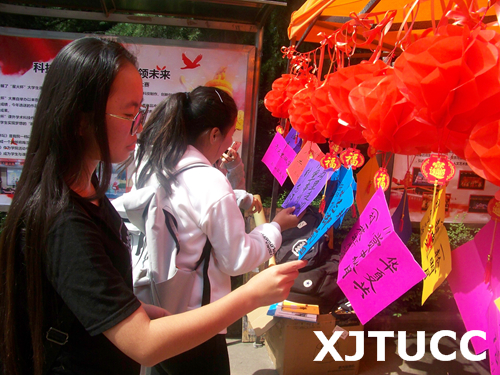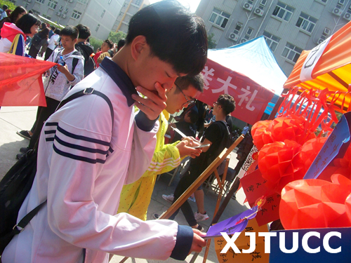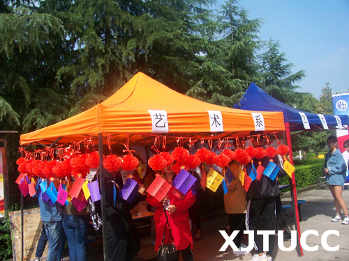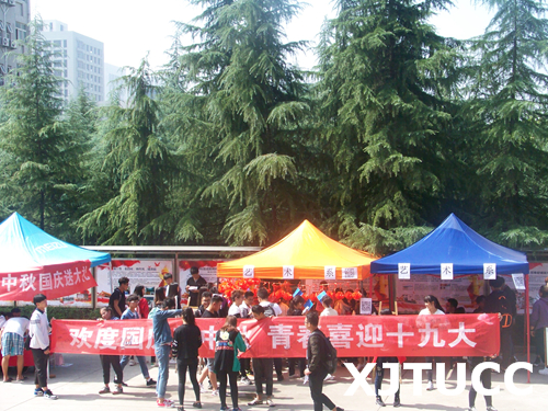 伴随着国庆、中秋的节日气氛,9月28日中午12点,西安交通大学城市学院艺术系团工委学生会在学生活动中心楼下举行了以“欢度国庆贺中秋,青春喜迎十九大”为主题的团日外展活动。