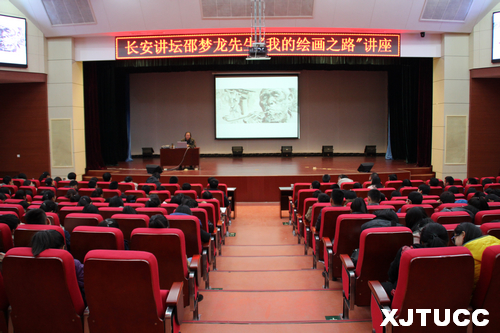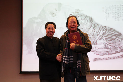 聘任仪式后,邵先生为艺术系师生做了"我的绘画之路"精彩讲座。邵先生表示,很荣幸能做为艺术系的客座教授与同学们在今后的绘画之路上交流沟通。他结合个人的绘画经历,从处事、交友、生活等多方面以渊博的学识、生动的事例、诙谐的语言为同学们做了一场精彩的报告,他鼓励同学们一定要坚守信念,勤于思考,不断丰富自我,完善自我。
