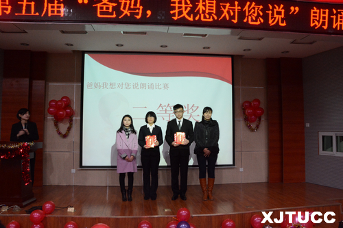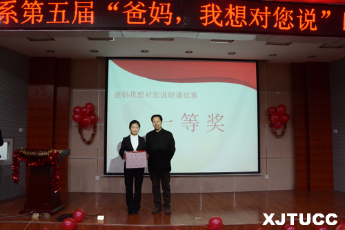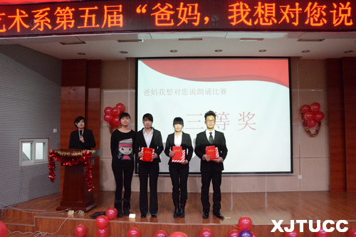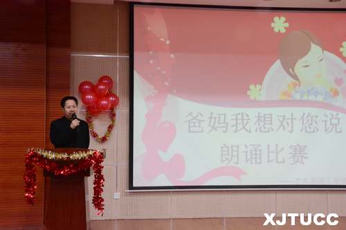 2014年12月10日19:00,西安交大城市学院艺术系团工委在F100报告厅成功举办第五届"爸妈,我想对您说"主题朗诵比赛。此次朗诵比赛邀请到艺术系主任解安宁、艺术系主任助理张春新、艺术系办公室主任程颖、管理系学生工作主管刘健、外语护理人文社科系刘畅等担任比赛的评委,艺术系全体教工莅临比赛现场。