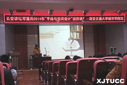 西安交大城市学院艺术系环境艺术设计专业于2014年12月2日晚上7:00在F100教室举行了手绘与空间的专题讲座。讲座由江西美术专修学院庐山艺术特训营副执行总裁,国家级手绘设计大赛金奖得主邓蒲兵老师主讲。艺术系全体环艺设计专业的师生参加了此次讲座。